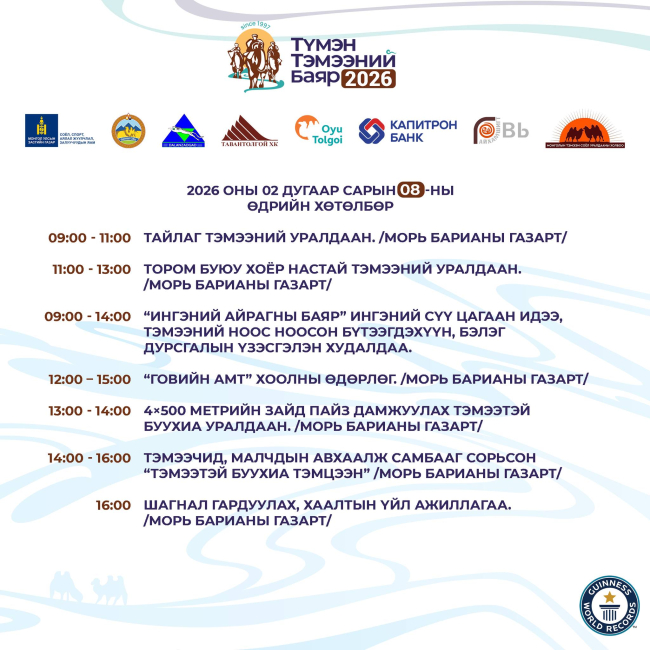 Монгол орны нүүдэлчин ахуйд зохицсон хоёр бөхт тэмээтэй холбоотой өв уламжлал, дэлхийд ондооших соёлыг таниулан сурталчлах 27 дахь удаагийн "ТҮМЭН ТЭМЭЭНИЙ БАЯР-2026" арга хэмжээ Өмнөговь аймгийн Даланзадгад хотноо 2026 оны 02-р сарын 06, 07, 08 өдрүүдэд зохион байгуулагдахаар боллоо.