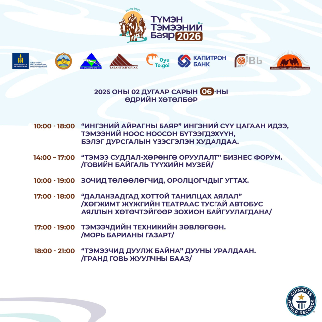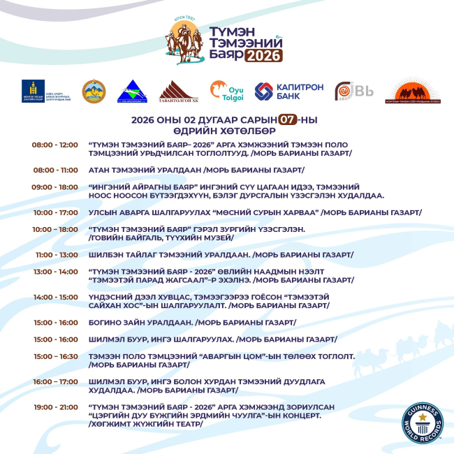 Энэхүү арга хэмжээ нь гадаад, дотоодын аялагчдын зорин ирж үзэж сонирхдог өвлийн хамгийн том арга хэмжээ хэдий нь болсон бөгөөд та бүхнийг "Түмэн тэмээний баяр"-т хүрэлцэн ирэхийг урьж байна.